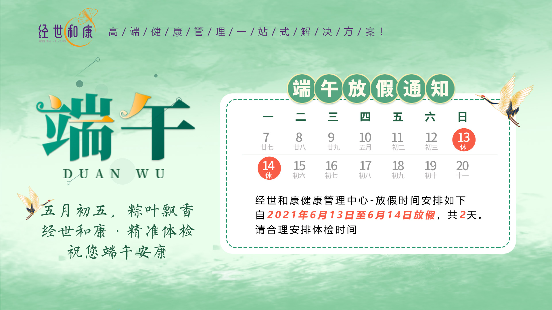 經世和(hé)康醫(yī)養健康管理(lǐ)中心端午<♥≤節期間(jiān)體(tǐ)檢時(shí)間(jiān)☆ 安排如(rú)下(xià):